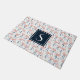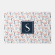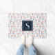 Tapis de porte monogramme avec un motif d'été flamingo exotique rose rose et un monogramme bleu personnalisé au centre.
