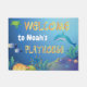 Tapis de bienvenue pour la maison de jeux pour enfants avec des créatures de mer sous la conception océanique de la mer. Modifiez le nom. L'image colorée montre une scène sous-marine avec tortue de mer, dauphin, poulpe, et plusieurs poissons et coraux. Idéal pour les petits amoureux de l'océan !