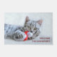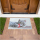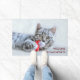Un tapis de bienvenue avec une photo de Noël mignonne d'un chat tabby gris mordant joyeusement un chapeau santa rouge. Ses gros pattes moelleuses rendent cette photo très agréable. Personnalisez avec un nom.