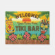 Tapis de bienvenue à thème Tiki Bar avec visages Tiki, coucher de soleil sur la plage, palmiers, plantes tropicaux et palissandre de bambou. Ajoutez votre nom à la personnaliser. Un style kitsch tropical amusant pour votre bar, salon Tiki ou luau.
