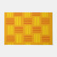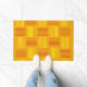 Ce mat de porte a un design moderne du milieu du siècle qui ressemble à un tissage avec des lignes rouges et jaunes sur un champ d'or.