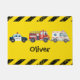 Cette adorable natte de bain personnalisée comporte de mignons véhicules d'urgence aquarelle, une voiture de police, une ambulance et un camion de pompiers.