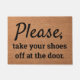 Tapis de porte qui dit "S'il vous plaît, enlevez vos chaussures à la porte."