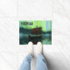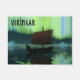 Une image légèrement stylisée d'un longship viking naviguant la nuit sous les aurores boréales là-bas quelques icebergs ; la plupart de l'équipage est endormi. Le texte "VIKINGAR" (Vikings) apparaît également.