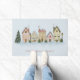 Destei's original hand-painted watercolor design featuring a row of five stone houses forming a Christmas village on a light blue background. Some houses are decorated with festive wreaths and bows, accompanied by old-fashioned street lamps, fir tree bushes and trees. Wisps of smoke curl from the chimneys and snow rests atop the scene. A light watercolor snow texture overlays the image, which can be removed if preferred. The design also includes a personalizable text area where you can add a family name, "Merry Christmas" text or any other custom message. This whimsical design brings a joyful and festive spirit to any holiday decor.