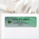 Une étiquette élégante avec des paillettes vertes, des feuilles dorées et des roses vertes.