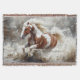 A dynamic painting of a paint horse running through water, capturing the powerful motion and natural beauty of this spirited animal in a wild setting.
