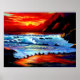 Evening waves crashing on the shore with a bright orange and red sunset.