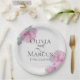Wedding Paper Party Plates | Painted pink peonies with light green rose leaves on a background of faux eggshell rice paper texture - A combination of script calligraphy combined with a minimalist, contemporary style text layout makes it a trending style wedding suite. Design created for TheBarefootBride™ by © WhimsicalArtwork™. This is part of a wedding stationery suite collection with matching wedding accessories also baby shower and other occasion stationery. Feel free to contact us if you need assistance.