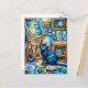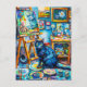 A blue-black cat sits in a painter's studio surrounded by colourful paintings in an artistic environment.