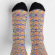 Pair of colorful socks featuring a vibrant geometric pattern in blue, red, and yellow. The toes and heels are black, adding contrast and creating a playful, energetic tone.