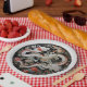 Paper plate featuring a pair of white Asian style dragons frolicking among flowers on a black background. Perfect for Chinese New Year, especially in the Year of the Dragon!