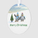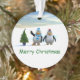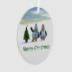Deux mignons pingouins en caricature se tenant heureux près d'un sapin de Noël dans la neige. Le garçon porte un casquette et une écharpe bas et la fille a un arc rouge sur la tête.