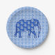 Mixed pattern digital graphic of a richly embellished elephant against an arabesque tiled background - cobalt blue with a white, lacy, paisley pattern