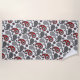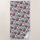 Beach towel in an ornate paisley pattern, in black, white and shades of grey / grey, accented with deep red, on a white background