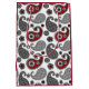 Ornate paisley pattern in black, white and shades of grey / grey, accented with deep red, on a white background