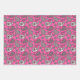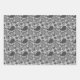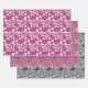 Wrapping paper in an ornate, lacy, paisley pattern in shades of light to deep fuchsia pink, accented with burgundy, on a pastel pink background, Black, white and grey on deep fuchsia pink, and black and white on a silver grey background
