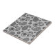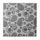 Ceramic tile in an ornate paisley pattern in shades of medium to dark grey, black and white, on a medium silver grey background