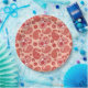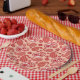 Paper plates in an ornate paisley pattern in shades of medium to deep coral orange, accented with white, on a pastel coral orange background