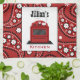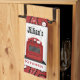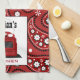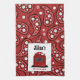 A kitchen towel featuring a red paisley design. Personalize with your name above red retro stove.