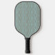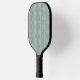 This pickleball paddle has a geometric design of sort of flat-ended ovals repeating across the design in brown on a field of pale blue.