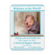 Design front features a blue background with white polka-dots as background to the photo you provide. Customizable heading and name of newborn is displayed in blue lettering against a white strip. Image of a toy train on tracks is displayed above name and birth information.