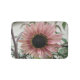 This awesome bath mat features a beautiful photograph of a pale pink sunflower. The sunflower is naturally pink and the petals have a pale pink outer ring and a darker pink inner ring. The middle where the seeds are is black. This photograph was taken in a garden.