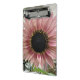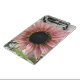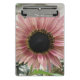 This awesome mini clipboard features a beautiful photograph of a pale pink sunflower. The sunflower is naturally pink and the petals have a pale pink outer ring and a darker pink inner ring. The middle where the seeds are is black. This photograph was taken in a garden.