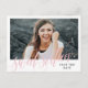 Sweet 16 save the date postcard with Sweet Sixteen written in a swirly pink calligraphy script atop a photo of the birthday girl. Add your information on the back of the postcard in black and pink.