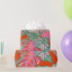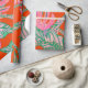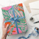 This design features painted, boldy coloured palm leaves and coleus. In colours of green, pink, blue and a firey coral background.