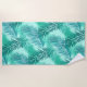 Beach towel in a print of overlapping palm leaf silhouettes, in shades of turquoise / peacock and teal, against a light aqua background