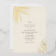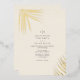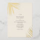 Off white cream beige background and grey text with palm leaves at top left and bottom right.