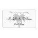 Étiquettes de bouteille d'eau de mariage sur la plage de palmier gris et noir personnalisé. Modèle autocollant élégant personnalisé avec silhouette de plamtree. Typographie de script élégant pour les noms de mariée et mariée et message de remerciement. Utilisez comme décor de table classe ou merci pour les invités à la mariage / fête de mariage. Le logo comprend le nom ou le monogramme plus la date du mariage. Design classique avec couleur arrière - plan personnalisable. Parfait pour les mariages de destination. Aussi grand comme étiquette de vin. Merci d'avoir rejoint notre journée spéciale.