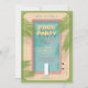 Pool Party Invitation featuring a illustrated swimming pool in a mid-century modern style. Designs include elements of blues, and pinks, palm leave fronds, swimming pool and retro design.