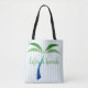 Stylish tropical feel all over print tote bag done in a light blue and white vertical stripe pattern, with graphics of a big blue and green palm tree. Green text reads Life's a beach and can be personalized to read what you want.