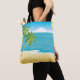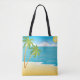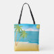 A scenic view of a palm tree beach with a bright sun. This design looks really effective on this Tote Bag