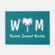 Personalized palm tree door mat for tropical beach home. Coastal scene. Monogram letter turquoise blue door mat for seaside home. Make your own custom monogrammed doormat with custom colour background. Add your own welcome message, family name, monogram, surname or funny quote. Cute gift idea for friends, newly weds and family with new home / housewarming party. Custom colour background. Elegant chic script typography. Personalizable doormat sign template. Create your own entry mat / rug for front door / entryway or hall / wedding venue, porch, garden etc. Customizable outdoor home decor / decorations for your house. Available in small and big large size. Fun typography with saying; home sweet home.