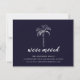 Faire-part tropicale mobile avec un palmier sur un arrière - plan bleu noir avec un dos rayé frais et moderne.
