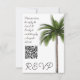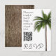 Palm tree, wedding QR code reply cards with tropical theme. One tall palm tree stands out over the white background on small, vertical cards. Create your own code to add to the template and make it simple for guests to reply to the wedding, showers or other large events. A short paragraph of text can be added to the left side asking guests to reply by a certain date. The back of the card has an image of palm tree bark.