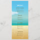 Palm tree & starfish tropical beach destination wedding menu card, featuring a tropical scenery: a palm tree with coconut on a sandy beach with starfish, blue sea/ocean water and the sky with the sun and clouds. Great for a summer, tropical, beach wedding. Blue, green, yellow, brown.