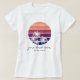Customize this cute beachy tee with your town or city name in handwritten script, with the state beneath in modern sans serif. Design features a vintage style gradient sunset with palm tree silhouettes overlaid.