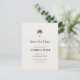 This save the date postcard features simple typography focal on the silhouette of a palm tree in black on ecru for a modern and minimalistic Save the Date card for your upcoming wedding. All text is editable to fit your personalized needs.