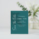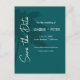 This save the date postcard features simple white on teal typography on the silhouette of a palm tree for a modern and minimalistic Save the Date postcard for your upcoming wedding. All text is editable to fit your personalized needs.