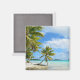 Souvenir photo magnet with a hanging palm tree on a white sand beach of a tropical island in the Pacific Ocean belonging to the Tahiti and Bora Bora archipelago French Polynesia.