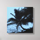 Posterised design of palm trees, beach, and sea. Blue and black scheme