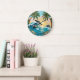 A vibrant wall clock design featuring tropical elements including palm trees, jumping dolphins, and a serene ocean sunset scene, evoking summer, nature, and marine vibes for your home decor.