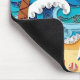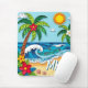 A coastal monogrammed mouse pad in a paper quilling style ai illustration of two palm trees, the sun, ocean waves, a beach and tropical flowers.
