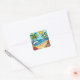 A coastal sticker in a paper quilling style ai illustration of two palm trees, the sun, ocean waves, a beach and tropical flowers.