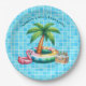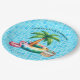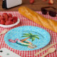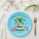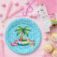 Hold an unforgettable pool party with this azure - light blue patio tile design that includes a palm tree, a cute flamingo and some cold refreshing drinks by the pool.
