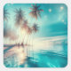 Postcard with pretty palm trees, a starry sky and reflection in the blue ocean water.